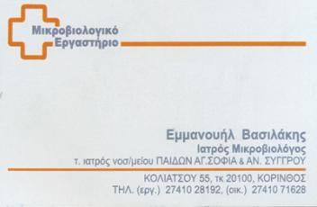 Ωράριο:Δευτέρα - Παρασκευή 07:00-11:00 & 18:00-20:00εκτός Τετάρτης απογεύματος customer tabsΕπικοινωνίαΜικροβιολόγοι - ΒιοπαθολόγοιΜικροβιολογικά ΕργαστήριαΥγείαΚολιάτσου 55, ΚόρινθοςΚΟΡΙΝΘΟΣ ΚΟΡΙΝΘΙΑΣΚΟΡΙΝΘΙΑΠΕΛΟΠΟΝΝΗΣΟΣ27410281926944914652vasilakisemman [at] yahoo.gr Φωτογραφίες Facebook LikeGoogle Plus OneShare on FacebookTweet Widget